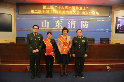 海麗雅集團董事長張旭明(右二)領取全國119消防獎,與山東省公安消防總隊總隊長馬先宏等合影