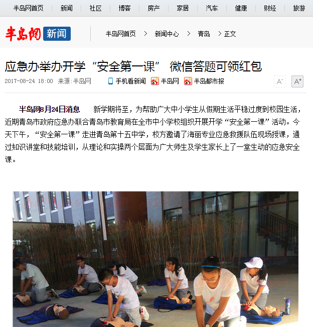 2017年8月24日,半島網(wǎng)對(duì)應(yīng)急中心為青島第十五中學(xué)的新生進(jìn)行開學(xué)安全培訓(xùn)活動(dòng)進(jìn)行直播及報(bào)道