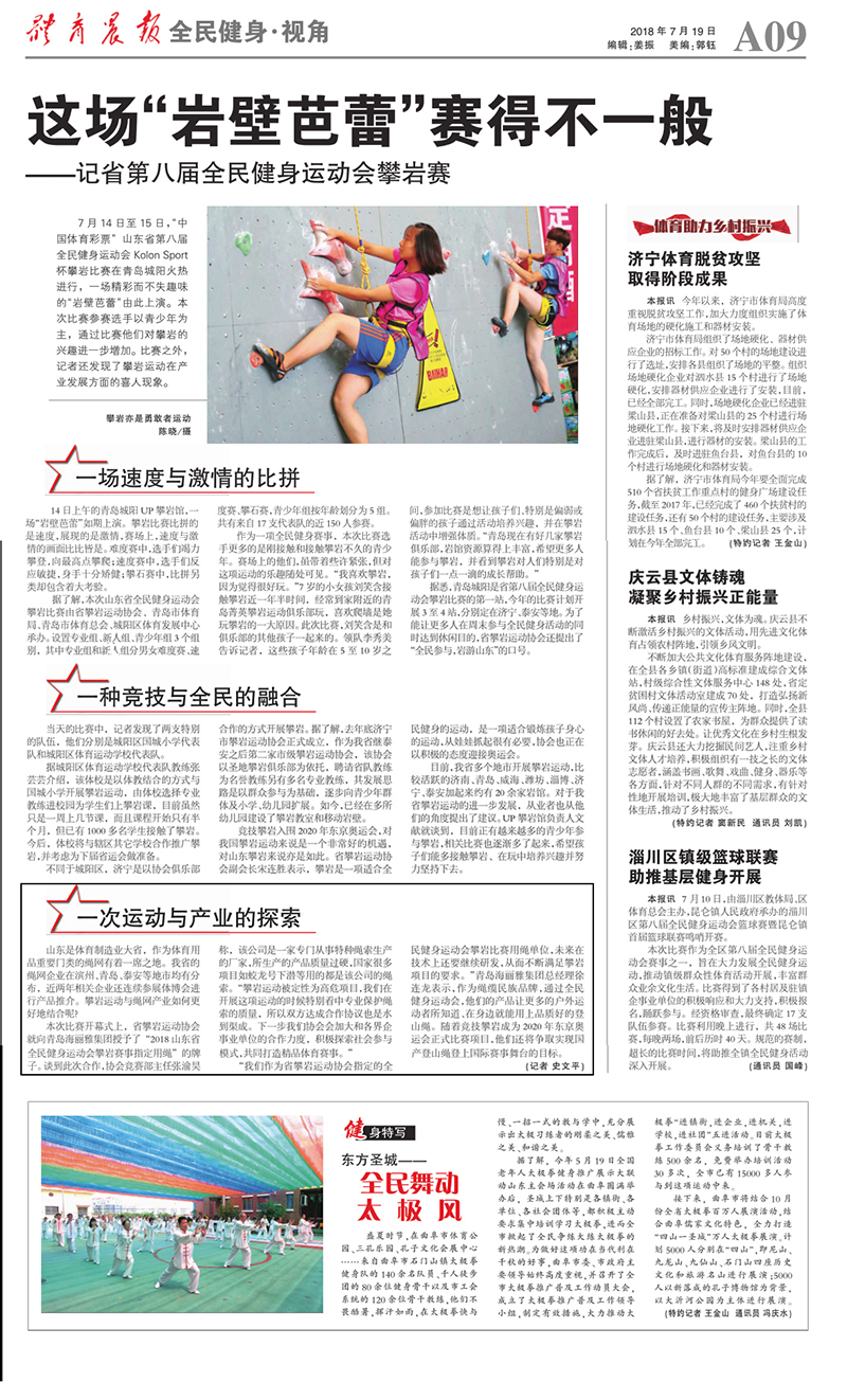 《體育晨報》以“這場巖壁芭蕾賽的不一般”為題,對公司研發生產的“蛟龍”動力繩成為2018山東省全民健身運動會攀巖賽事唯一指定用繩等內容進行報道。