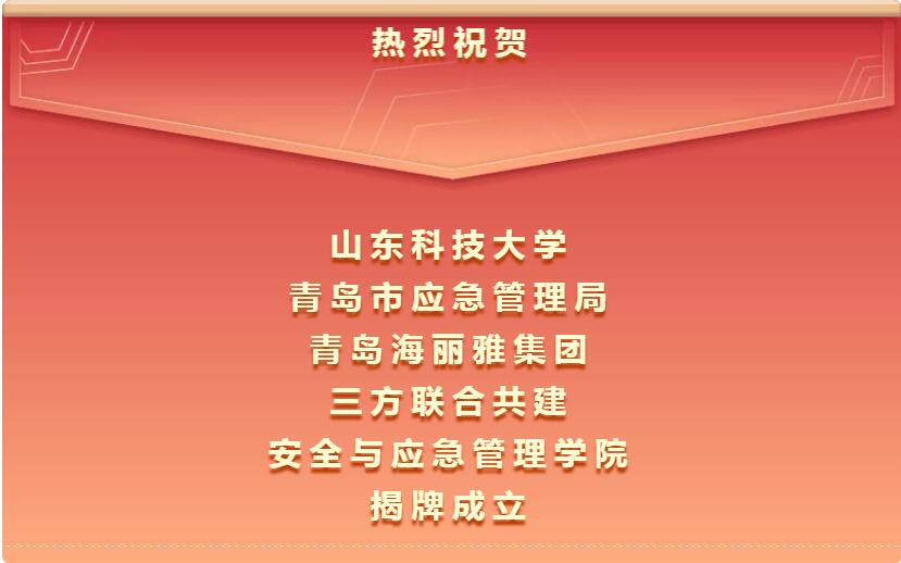 2019年7月15日,山東科技大學、青島市應急管理局、青島海麗雅集團三方聯(lián)合共建的“安全與應急管理學院”舉行揭牌儀式。中央黨校(國家行政學院)應急管理培訓中心(中歐應急管理學院)主任(院長)/中國應急管理學會副會長馬寶成、山東科技大學黨委書記羅公利、 青島市政府副秘書長萬建忠、青島市應急管理局局長張建剛、青島海麗雅集團董事長張旭明出席會議。