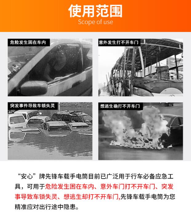 2、安全錘功能:配有帽蓋式安全錘,使用方便,可在緊急時刻車門打不開時砸碎車窗玻璃,進行逃生(敲擊玻璃四角);