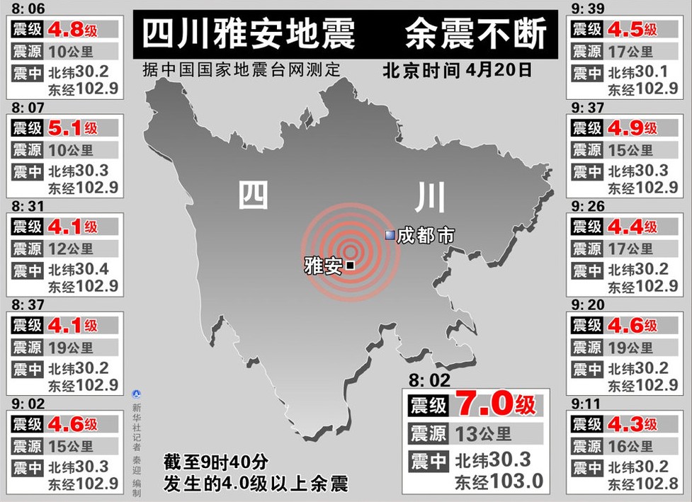 此外,經(jīng)過國家電網(wǎng)德陽電業(yè)局15名電力搶險(xiǎn)人員2小時(shí)的搶修,蘆山縣黎明水廠13時(shí)恢復(fù)供水。該水廠檢驗(yàn)員吳江說,這是震后首個(gè)恢復(fù)的水廠,可滿足城區(qū)10余萬人的應(yīng)急用水需求。
