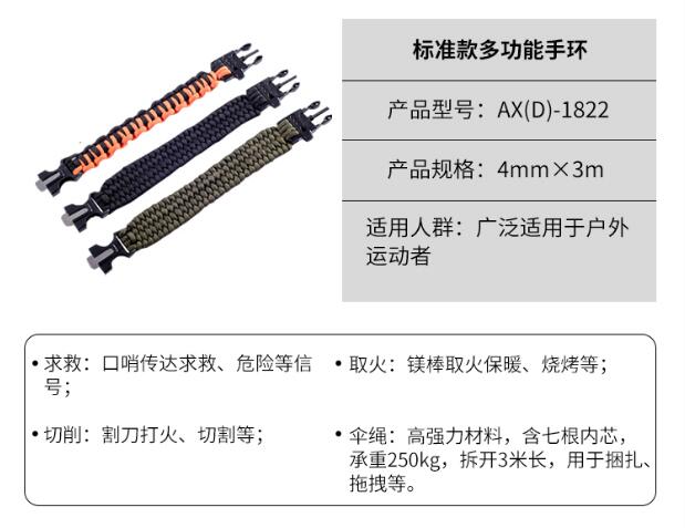 傘繩:高強力材料,包含七根內芯,承重250kg,拆開3米長,用于捆扎、拖拽等。