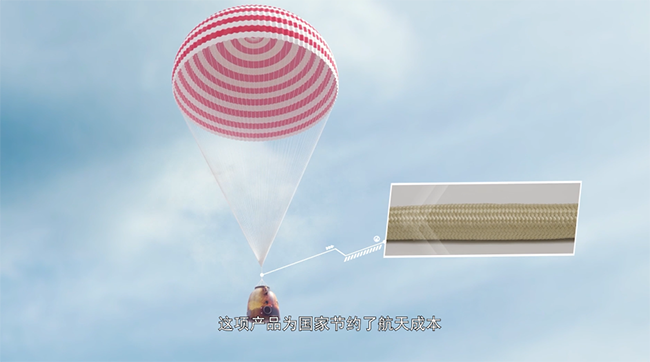 為航天科技集團508所研制的纖維垂掛吊索,用于連接返回艙和降落傘,咱們國家研制大型載人宇宙飛船,相應的返回艙也增大很多,為了搭載6-10名宇航員和往返運輸貨物,要想辦法在其他部位減重,為此,我們專門研發了此款載人飛船返回艙垂掛吊索產品,重量僅4.5kg,替代了以前100多公斤的鋼纜,為國家節省的上億資金。